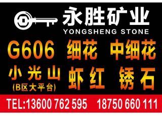 永勝礦業(yè)主營產(chǎn)品:象牙白(光面),象牙白1,G606,黃銹石,霞紅,G606(副礦),G606(礱石),G606(正礦),蝦紅1,銹石2,銹石(荔枝面),黃銹石(荔枝面),銹石,蝦紅,蝦紅G681,蝦紅荔枝面,G681,G681蝦紅(光面)企業(yè)地址:福建泉州南安市聯(lián)合二路匯創(chuàng)物流園